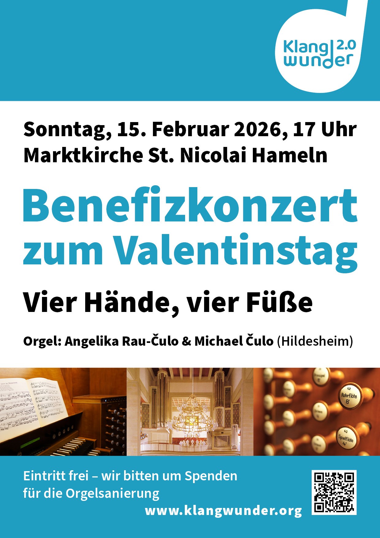 Angelika Rau-Čulo (Kirchenmusikdirektorin und Kantorin an St. Michaelis Hildesheim) und ihr Mann Michael Čulo (Mariendom Hildesheim) spielen zum Valentinstag unterhaltsame Orgelmusik für vier Hände und vier Füße. Eintritt ist frei (Spenden für die Orgelsanierung erbeten)